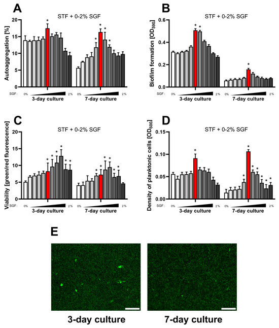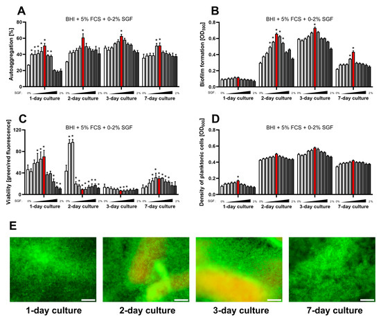 Assessment of the impact of a one-week culture on the physiological parameters of H. pylori 2CML in STF and the concentration gradient of SGF (0–2%, with 0.2% intervals). An increasing concentration of SGF is marked by the intensified gray of bars. (A) Autoaggregation measured microscopically by estimating the degree of the observation field coverage, n = 3. (B) Biofilm formation determined by a crystal violet staining method and spectrophotometric measurements, n = 9. (C) Viability of bacterial cells determined by fluorescent staining with a LIVE/DEAD kit and a ratio of green/red fluorescence, n = 3. (D) Density of planktonic cells assessed by spectrophotometry, n = 9. (E) A set of images showing the growth of H. pylori 2CML under the most optimal conditions of the current model—STF + 1% SGF (marked with red bars). Scale bars, 20 µm. * indicates statistical difference (p < 0.05) with the control—0%. Because of the low values for all the physiological parameters during 1- and 2-day cultures, these data were not recorded.