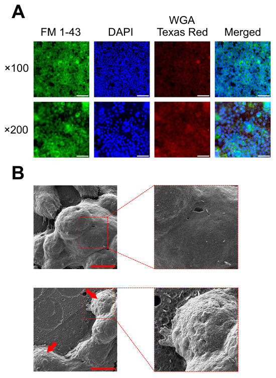 For fluorescent microscopy, the semi-permeable membranes coming from the inserts were cut out with a scalpel and placed on glass slides. Then, they were stained with 20 µL of a saline solution with a mixture of fluorescent dyes: FM 1–43 (green fluorescence; 0.5% v/v), DAPI (blue fluorescence; 1% v/v), and WGA-conjugated Texas Red (red fluorescence; 1% v/v) (all from ThermoFisher, Waltham, MA, USA) to visualize the biofilm [71], eukaryotic nuclei [72], and mucus glycoproteins (mucins) [73,74], respectively. Observations were performed using a Carl Zeiss inverted fluorescence microscope. Using the Bioflux Montage software version 7.10.3.390 (Fluxion, San Francisco, CA, USA), the degrees of bacteria/eukaryotic nuclei and bacteria/mucins co-localizations were counted. Measurements were performed in three biological repetitions with three technical replications (n = 9).