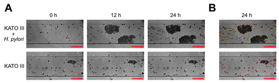 To obtain a co-culture of H. pylori with KATO III in microfluidic conditions, the Bioflux 1000Z (Fluxion, San Francisco, CA, USA) was applied [16,75]. This equipment was additionally combined with a Carl Zeiss inverted fluorescence microscope and a Pecton environmental chamber XL S1 (Carl Zeiss, Jena, Germany), allowing for real-time observations and maintenance of the desired temperature and gaseous conditions, respectively. All experiments were performed at 37 °C and microaerophilic atmosphere.
