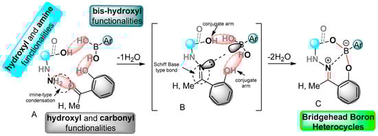 SAs or 2-OH-acetophenones provide the C=O moiety for condensation with the amine of the amine- and OH-containing bis-functional individual (Figure 1A, hydroxyl and carbonyl functionalities and hydroxyl and amine functionalities, respectively) so as to provide an “imine-type” conjugate, in certain cases named the “Schiff base” (Figure 1B). Continuously, the dehydration of the ABA’s two hydroxyl groups with the Schiff base conjugate’s two arms, which sequences the condensation reaction, removes two more water molecules to give the bridgehead boron heterocycle (Figure 1B,C). The iminic nitrogen has its lone pair electrons in position to overlap with the electron-free Boron p-bond and to form a polycyclic structure, giving, depending on the rigidity of the final structure, potential applications [].