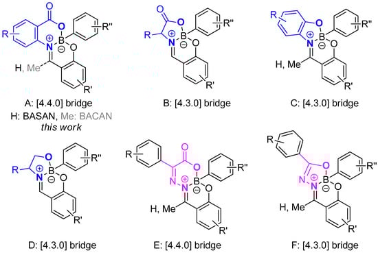 Bridgehead boron complex heterocycles: [4.4.0] [(A) (BASAN, BACAN—not known), (E)] and [4.3.0] (B–D,F). Blue color indicates counterparts with OH and NH2 functionalities and pink color with OH and =N-NH2 functionalities.