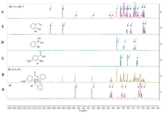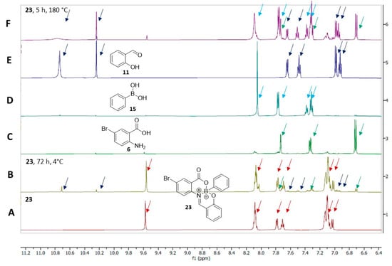 The stability test of the compounds towards hydrolysis was qualitative. Freshly prepared solutions of 23 and 27 were heated in DMSO-d6 at 180 °C, and NMR spectra were recorded at 2 and 5 h. Derivative 23 decomposed completely to its components after heating for 5 h (Figure 3F: dark blue arrows—SA 11, Figure 3E; light blue arrows—PBA 15, Figure 3D; green arrows—5-Br-AA 6, Figure 3C), whereas the sample, after standing for 72 h in the fridge, showed considerable stability (Figure 3B: time 72 h; red arrows—compound 23, Figure 3A: time 0 h).