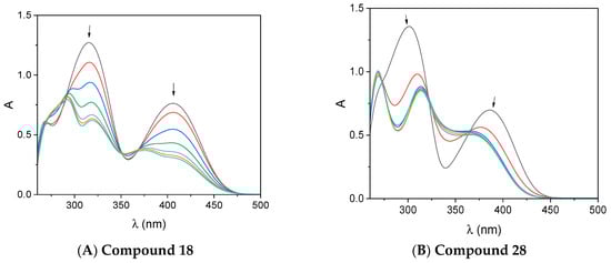 UV–vis spectroscopy allows for the monitoring of structural changes induced by the interaction of CT DNA with the examined compounds (UV–vis spectra of compounds 18–24 and 26–48, Supporting Information part 2, Section S.1) and the determination of the corresponding DNA-binding constants (Kb) (Supporting Information part 2, Section S.2.1, Equation (S1)). In the UV–vis spectra of the compounds with increasing amounts of CT DNA, two intense bands appeared: band I in the region 387–420 nm and band II in the region 295–335 nm, while for compounds 24, 41, 43 and 45–48, an additional third band (band III) appeared in the range 265–278 nm (Supporting Information part 2, Sections S.1 and S.3 for UV–vis spectra without CT DNA and with increasing amounts of CT DNA, respectively). The addition of a CT DNA solution resulted in a significant decrease in the absorbance of bands I and II, which, in some cases, led to disappearance of the band (Figure 5 and Supporting Information part 2, Section S.2.2.1). The effect of CT DNA on band III was a slighter increase in the absorbance (Table 1). In most cases, the bands exhibited a slight red-/blue-shift (Table 1). All these changes observed in the UV–vis spectra of the compounds in the presence of CT DNA offer evidence of the existence of their intense interaction with CT DNA, although the mode of interaction cannot be safely predicted [].