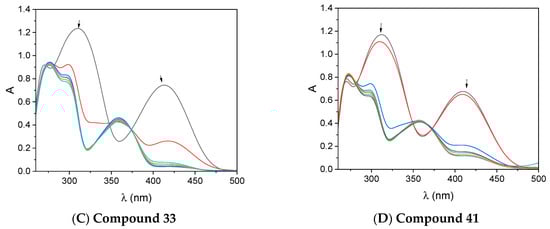 (A–D): UV–vis spectra of compounds 18, 28, 33 and 41, respectively. Concentration: 10−4 M in DMSO in the presence of increasing amounts of CT DNA. The arrows show the changes upon increasing the amount of CT DNA.