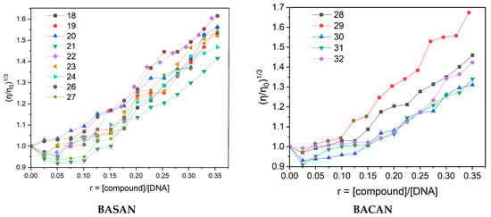 Within this context, the viscosity of a CT DNA solution (0.1 mM) was monitored upon the addition of increasing amounts of compounds 18–24 and 26–48 (up to the value of r = 0.36, Figure 6).