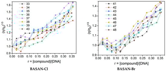 For the third and fourth groups (BASAN-Cl 33–40 and BASAN-Br 41–48) with the Cl- and Br-substituted SA and ABA, respectively, we observe differences among them and with the other two groups. For example, the third group shows an intercalative profile from the beginning, contrary to groups 1 and 2 (Figure 6, BASAN-Cl and BASAN, BACAN). On the contrary, all compounds of group 4 show a significant DNA length decrease, and the final DNA lengths, as depicted with the viscosity values (η/η0)1/3, do not reach the same values (Figure 6, BASAN-Cl and BASAN-Br, respectively).