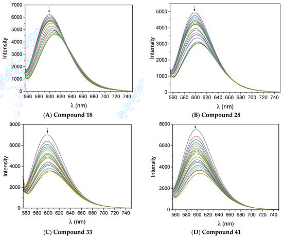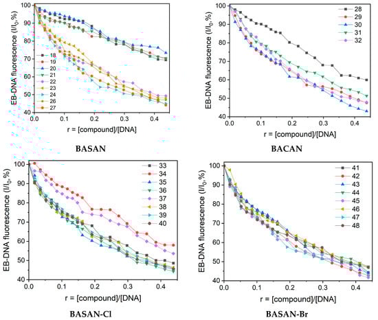 Figure 7 depicts the fluorescence emission spectra of the EB-DNA adduct and the changes caused by the sequential addition of incremental amounts of compounds 18, 28, 33 and 41, which all derive from 5-Me AA 2. Even at a glance, one may observe that 41 is a better intercalator than 33. Derivatives 28 and 18 decrease in the same order (Figure 8, Table 2, (BACAN and BASAN, respectively)). Regarding the Ksv constants, the Kq constants, and the percentage of EB-DNA fluorescence quenching (ΔI/Io %), which were all calculated from the fluorescence spectrometry experiments (Table 2), we may conclude KSV,41 (4.60 × 104 M−1) > KSV,33 (4.11 × 104 M−1) > KSV,28 (2.82 × 104 M−1) > KSV,18 (1.84 × 104 M−1) and, subsequently, Kq,41 (2.00 × 1012 M−1 s−1) > Kq,33 (1.79 × 1012 M−1 s−1) > Kq,28 (1.23 × 1012 M−1 s−1) > Kq,18 (0.80 × 1012 M−1 s−1).