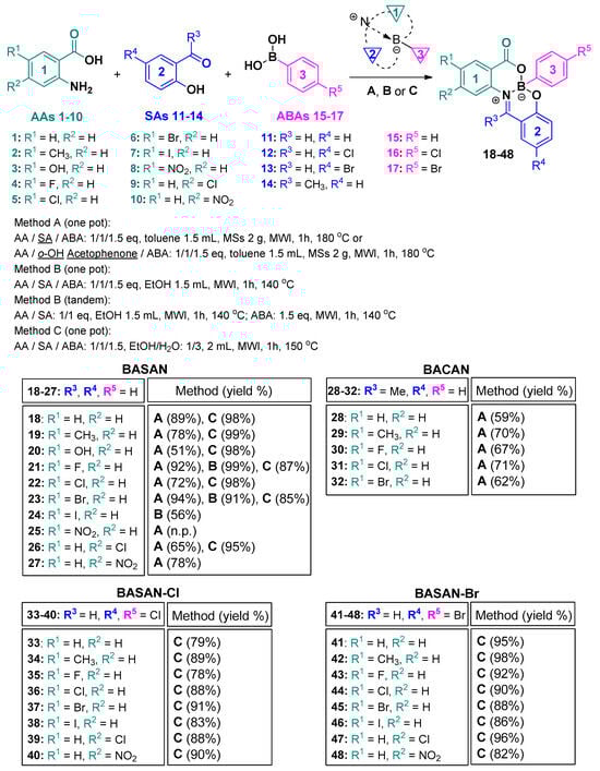 The investigation of the most environmentally safe and green conditions for the synthesis of bridgehead bicyclo[4.4.0]boron heterocycles has led to the selection of the solvent system EtOH/H2O at a ratio of 1/3 that produced, under microwave irradiation for 1 h and in very high yields, twenty-six derivatives, out of which only two were previously known. The methodology afforded the assembly via the condensation and dehydration reactions of AA, SA and PBA. SA, as one component of the triadic system, tolerated a wide variety of substituents on AA, such as electron-withdrawing and electron-donating groups, probably giving the initial in situ formation of the intermediate imine, which was further condensed with PBA. An exception was the 5-NO2 AA, where the -I and -R substituents gave very unstable or no products. In total, three SAs as well as three ABAs, free of substituents or as their Cl and Br derivatives, have been used as counterparts of ten AAs. With the less-activated Cl- and Br-substituted SAs and ABAs, the reactions did not work with 5-NO2 and 5-OH AAs, and thus, the corresponding BASAN-Cl and BASAN-Br derivatives were not formed.