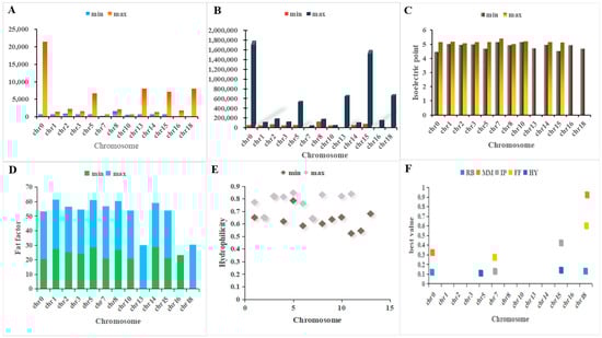 Physicochemical properties of AGL family genes: (A) Residual base. (B) Molecular mass/KD. (C) Isoelectric point. (D) Fat factor. (E) Hydrophilicity. (F) Maximum distribution of chromosomes. The X-axis indicates the chromosome on which the AGL sub-family genes are located, and the Y-axis indicates the maximum and minimum values of the corresponding physicochemical properties of the genes distributed on this chromosome.