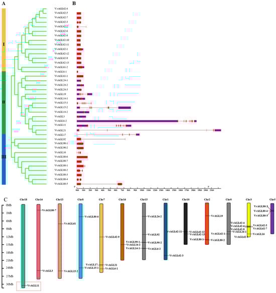 Sequence analysis and chromosomal location of VvAGLs: (A) The phylogenetic tree generated using the MEGA11.0 program with the Maximum Likelihood method. Yellow, green and blue colours represent different branches; red colour indicates the CDS region of the gene structure and purple colour represents the exons of the gene. (B) The exon–intron composition of AGL genes. The coding sequences (CDS) and up- or down-stream regions of AGL genes are represented by red and purple boxes, respectively. Lines represent the introns. (C) The chromosome localisation of VvAGLs. The red dashed box indicates the distribution of key AGL family members on the chromosome. Different colours represent different chromosomes.