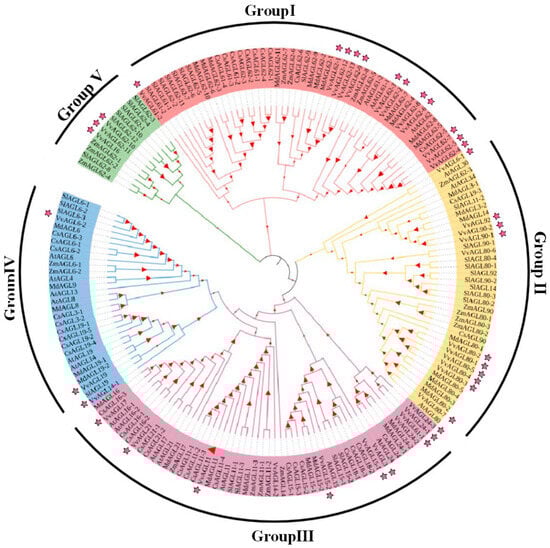 Phylogenetic analysis of the AGL family across six species: The phylogenetic tree was generated after an alignment of deduced Vitis vinifera, Zea mays, Arabidopsis thaliana, Citrus sinensis, Malus domestic, and Solanum lycopersicum AGL domains at the N-terminus. We constructed the phylogenetic tree using the Maximum Likelihood method against MEGA11.0 to study the evolutionary relationship between species. Based on the results of the clustering analysis of the homologous gene family, a single copy of the homologous gene was selected for multi-sequence alignment [using MUSCLE software (MEGA11.0) for sequence alignment] and a phylogenetic tree was constructed based on the single-copy gene method. Stars represented VvAGLs family members, triangular stars represented the main members of VvAGLs, different colors represented different groupings.