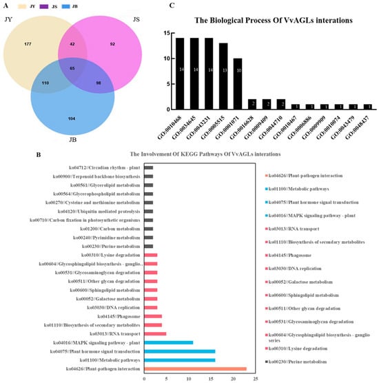 GO and KEEG enrichment analysis of VvAGLs family: (A) Number of interacting proteins in different periods. (B) The KEGG pathway annotation of the top 42 significant enriched pathways. (C) The GO analysis of 14 biological processes. Numbers on columns: The number of interacted genes involved in the GO pathway. ko00604//Glycosphingolipid biosynthesis—ganglio series.