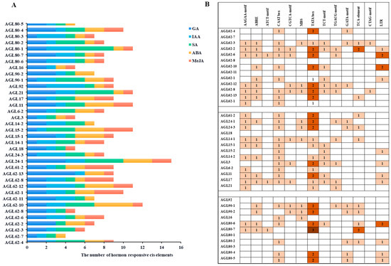 Screening and analysis of cis-elements in the promoters of VvAGLs: (A) The number of hormone-responsive cis-elements in promoter regions of VvAGLs; (B) Types of hormone-responsive cis-elements in promoter regions of VvAGLs. ABRE: ABA-responsive cis-elements; AuxRR-core and TGA-element: IAA-responsive cis-elements; CGTCA-motif and TGACG-motif: MeJA-responsive cis-elements; TCA-element and SARE: SA-responsive cis-elements; GARE-motif, P-box and TATC-box: GA-responsive cis-elements. ABA: abscisic acid; CTK: cytokinin; AUX/IAA: auxin–response repressor protein/indole acetic acid; SA: salicylic acid; MeJA: methyl jasmonate. Lighter to darker colous represented an increase in the number of cis-elements.
