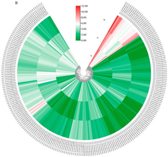 To further understand the biological functions of the grape AGL gene family, cis-elements prediction revealed that this gene family mainly contains cis-elements related to hormone regulation and adversity stress, including the methyl jasmonate response element (TGACG-motif), abscisic acid response element (ABRE), salicylic acid response element (TCA-element), drought response element (MBS), and low-temperature response element (LTR). The hormone- and stress-responsive action components were quantified at the highest levels compared to the tissue-specific elements, with the exception of the light-responsive element, which had the highest number. This suggests that the VvAGLs may have a strong sensitivity to hormones and stress (Figure 6A). The fact that all members of the VvAGL family contain both the light-responsive element and the hormone-responsive element may mean these two cis-elements are critical for the growth and development of green plants. To further understand the potential roles of VvAGL family members in hormone response, we screened the hormone-responsive cis-elements in their promoters, and all members of the VvAGL family contained hormone-responsive cis-elements, mainly GA-, IAA-, SA-, ABA-, and MeJA-responsive cis-elements (Figure 6B), implying that most members of the grape AGL gene family may respond to multiple adversity stresses and hormone regulatory elements at the same time. In addition, all of them contain growth factors, light-responsive, and anaerobic-induced regulatory elements, which may be related to their corresponding regulation.