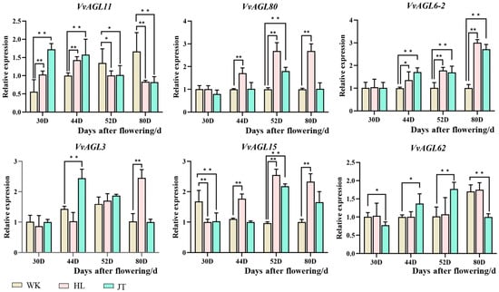 Expression of VvAGL family members in grape seed. Asterisks indicate a significant difference between different development periods using Student’s t-test (* p < 0.01; ** p < 0.05); WK ‘Wink’; HL ‘Blush seedless’; JT ‘Jintian Huangjia seedless’.