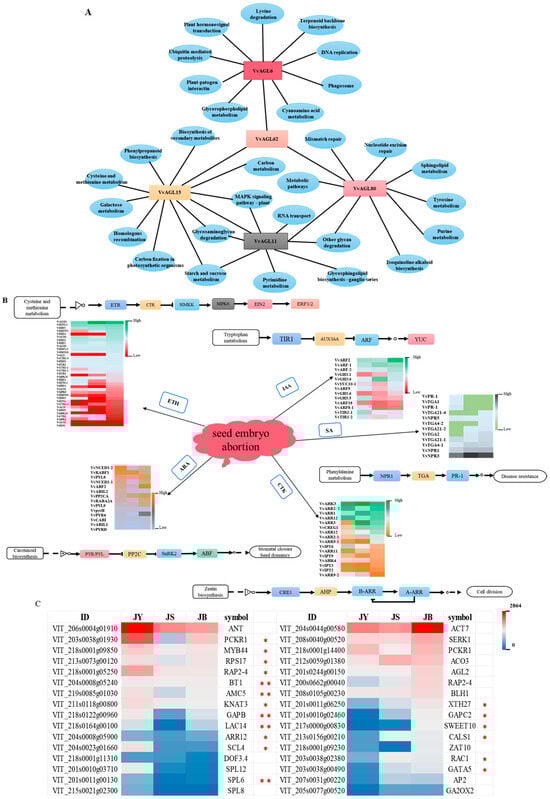 Expression analysis of VvAGL and reciprocal proteins: (A) Expression of the VvAGL family at different developmental periods. (B) Expression of VvAGL reciprocal proteins at different developmental periods. (C) Proteins are specifically expressed in different hormone metabolic pathways. JY: Stage of seed development; JS: Stage of seed beginning to abort; JB: Late stage of seed abortion; Asterisks indicate a significant difference between JY, JS, and JB by Student (* p < 0.05; ** p < 0.01).