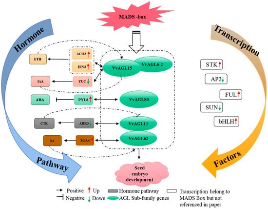 Numerous studies have reported that MADS-box transcription factors were involved in regulating the process of plant seed development and play an important role in flower development, control of flowering time in flowering plants, and partially in the development of plant nutrient organs []. Our proposal that VvAGL might regulate grape seed abortion by responding to multiple hormonal interactions is supported by this work, in which we identified all members of the VvAGL family and formed the crosstalk of major VvAGLs to describe above and revealed their potential regulatory network in response to multi-hormonal interactions to regulate grape seed abortion (Figure 10). Moreover, we found that only several VvAGLs were regulated in seed abortion by participating in hormone synthesis and signal transduction; however, most VvAGL members remained almost unchanged in this process, and the relevant genes in the ABA, CTK, SA, ETH, IAA signalling pathway were altered with changes in AGLs expression during grape seed abortion, of which AGL11, AGL80, AGL62, AGL15, and AGL6-2 may have a critical role in plant seed abortion by responding to different hormonal changes. Similarly, the previous reports that CmAGL11 plays an important role in the somatic embryogenesis process in Chinese chestnut, possibly by regulating GA, IAA, and ETH pathways []; in tomato, the genome-wide transcriptomic profiling of Sl-AGL11-overexpressed fruit and sepals also showed that the expression of genes related to GA, IAA, and ETH pathways was changed by Sl-AGL11 overexpression []. In Zanthoxylum armatum, AGL11 was involved in the biosynthesis and signalling of ABA, ETH, CTK, GA, IAA, and SA []. Transcriptome expression profiling of Jatropha curcas ovule development revealed that AGL regulates ovule development by upregulating the expression levels of genes related to signalling pathways in response to GA and JA signalling processes; moreover, the upregulation of BR signalling genes during ovule development might have been regulated by other phytohormone signalling pathways through crosstalk []. The expression level of AGL in the seed of grapevine saprophytes exogenously administered with GA3 showed an initial increase and then a decrease, indicating that AGL can mediate the seed abortion process by responding to the hormone change []. Recent molecular analyses illustrated how GA treatment induced parthenocarpy by influencing the miRNAs and GAMYB genes []. As seed development progressed, the GAMYB gene was increasingly expressed in seeded grapes, and the GAMYB gene response indicated that GA functions in seed development and seed abortion. Indeed, gibberellic acid (GA) and abscisic acid (ABA) were commonly used to increase berry size, reduce seed trace size, and promote seed development [,]. The cis-element analysis of the VvAGL11 promoter in ‘Flame Seedless’ treated with GA3 showed that VvAGL11 was up-regulated, which suggests that exogenous GA3 could affect seed coat development []. Furthermore, the transcript levels of the salicylic acid (SA) genes were higher in ‘Thompson Seedless’ []. All of these results suggest that AGL plays an important role in modulating hormone balance. Besides these, AGLs interacted with five hormone-responsive transcription factor genes, thereby leading to seed abortion, indicating that VvAGLs promote the induction of seed abortion, possibly by mediating multi-hormonal signalling pathways.