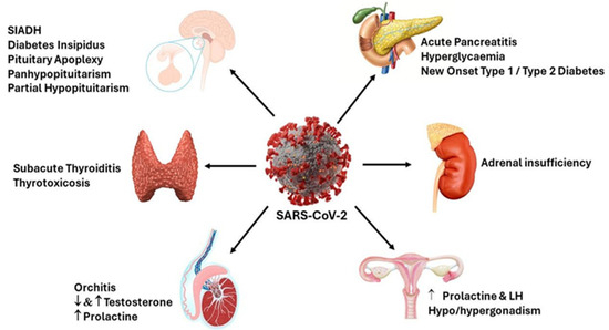 Adrenal insufficiency and COVID-19 exhibit a reciprocal influence on one another, with individuals afflicted by adrenal insufficiency face an elevated risk of contracting the infection. This heightened susceptibility is likely due to the decreased production of cortisol in those with adrenal insufficiency [40]. Adrenal insufficiency following acute adrenal infarction and adrenal hemorrhage has been documented in case studies post-COVID-19 [40,41]. SARS-CoV-2 has been shown to inhibit the function of the thyroid gland, leading to conditions like subacute thyroiditis and thyrotoxicosis, as well as affecting the secretion of prolactin and male sex hormones [42]. COVID-19 may adversely affect thyroid function through the direct viral invasion of the thyroid gland. Additionally, the virus can instigate immune system dysregulation, which may aggravate autoimmune thyroid diseases. Disruption of the HPT axis is another consequence, leading to abnormal levels of thyroid hormones. Furthermore, the stress induced by the infection and its treatment may further compromise thyroid function, resulting in both short-term and long-lasting thyroid disorders. Moreover, the virus can target the pancreas, causing acute pancreatitis, hyperglycemia, and the onset of new cases of type 1 or type 2 diabetes [17,43]. COVID-19 can impair both the endocrine function of the pancreas, leading to issues with insulin production and glucose regulation, and its exocrine function, potentially causing pancreatitis and digestive problems [44]. The underlying causes for this phenomenon encompass a multitude of factors, such as stress-induced hyperglycemia, the administration of steroids for COVID-19 treatment, and the direct impact of the virus on pancreatic function [15,26].