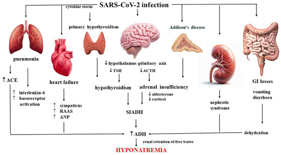 Thyroid function can be disrupted by the SARS-CoV-2 virus, leading to hypothyroidism. This condition is associated with reduced renal perfusion and a reduced glomerular filtration rate (GFR), which can enhance water retention and increase ADH activity. Furthermore, the combination of reduced renal function and increased ADH can lead to dilutional hyponatremia in hypothyroid patients [119].