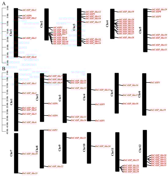 The chromosomal location of the AtCASP and OsCASP genes in A. thaliana and O. sativa. (A) The chromosomal location of the AtCASP genes in A. thaliana. (B) The chromosomal location of the OsCASP genes in O. sativa. The chromosomal distribution information of the CASP genes was generated from the GFF file information of A. thaliana and O. sativa.