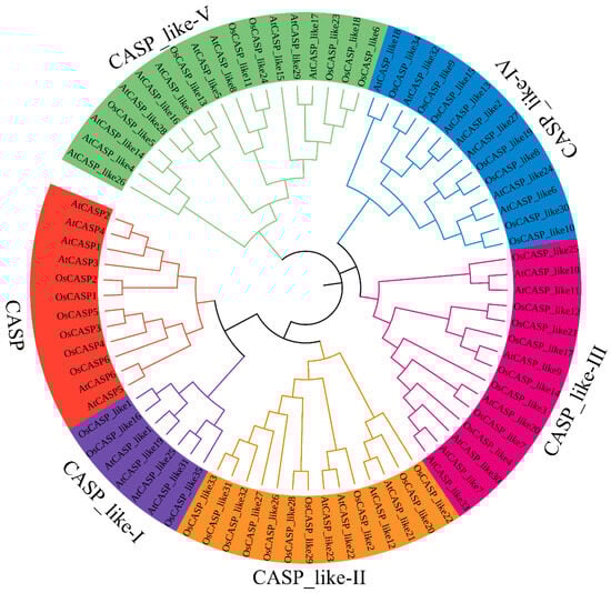 The phylogenetic tree constructed using 39 OsCASPs and 41 AtCASPs provides valuable insights into the evolutionary relationships among these proteins. As shown in Figure 2, these CASPs were divided into six subfamilies (CASP, CASP_like-I, CASP_like-II, CASP_like-III, CASP_like-IV and CASP_like-V) (Figure 2). Furthermore, CASP, CASP_like-I, CASP_like-II, CASP_like-III, CASP_like-IV and CASP_like-V contained twelve (six AtCASPs and six OsCASPs), seven (four AtCASPs and three OsCASPs), fourteen (four AtCASPs and ten OsCASPs), fifteen (seven AtCASPs and eight OsCASPs), fourteen (seven AtCASPs and seven OsCASPs) and eighteen (ten AtCASPs and eight OsCASPs) members, respectively. This variation in subfamily composition could reflect the distinct evolutionary trajectories and functional specializations of CASPs in these two plant species. Previous studies have shown that AtCASP1, AtCASP3 and OsCASP1 were involved in the formation of the endodermal Casparian strip and the selective uptake of mineral elements [,]. Given the close evolutionary ties between CASP and CASP_like-I (Figure 2), it is plausible that the CASP_like-I subfamily genes may also be involved in these processes in rice and Arabidopsis. The categories of AtCASPs and OsCASPs confirmed the diversity of their protein structures, and hinted that different subfamily members might have different functions.