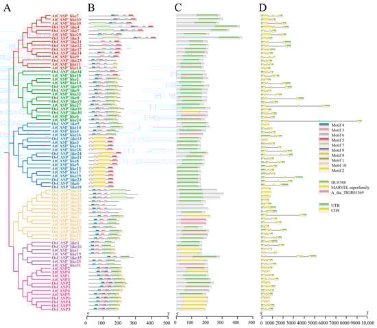 The hidden Markov model (HMM) of the DUF588 domain (PF04535) was utilized to conduct a thorough search for CASP genes in A. thaliana and O. sativa, resulting in the confirmation of 39 and 41 CASP genes, respectively (Supplemental Table S1). Notably, our analysis identified 22 additional CASP members in rice compared to the previously reported 19 members [], bringing the total number of CASP genes in rice to 41. To facilitate identification, we designated these genes as AtCASP_like1–AtCASP_like33 and OsCASP_like1–OsCASP_like35, with the exception of AtCASP1–AtCASP6 and OsCASP1–OsCASP6 (Figure 1), which retained their original nomenclature.