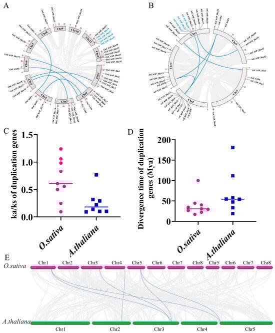The duplication events, synteny and Ka/Ks analysis of the CASP genes in rice and Arabidopsis. (A) The duplication events of the CASP genes in rice. The genes in a bule color represent the tandem duplications and the red lines represent the whole segmental duplication genes. (B) The duplication events of the CASP genes in Arabidopsis. The genes in a blue color represent the tandem duplications and the red lines represent the whole segmental duplication genes. (C) The Ka/Ks ratio calculations of the CASP gene pairs in rice and Arabidopsis. The pink and purple lines represent the median of ka/ks ratio. (D) The divergence time predictions of the CASP gene pairs in rice and Arabidopsis. The pink and purple lines represent the median of Mya. (E) The synteny analysis of the CASP genes between rice and Arabidopsis. The collinear blocks between rice and Arabidopsis are shown by gray lines. The syntenic CASP gene pairs between rice and Arabidopsis are highlighted by blue lines.