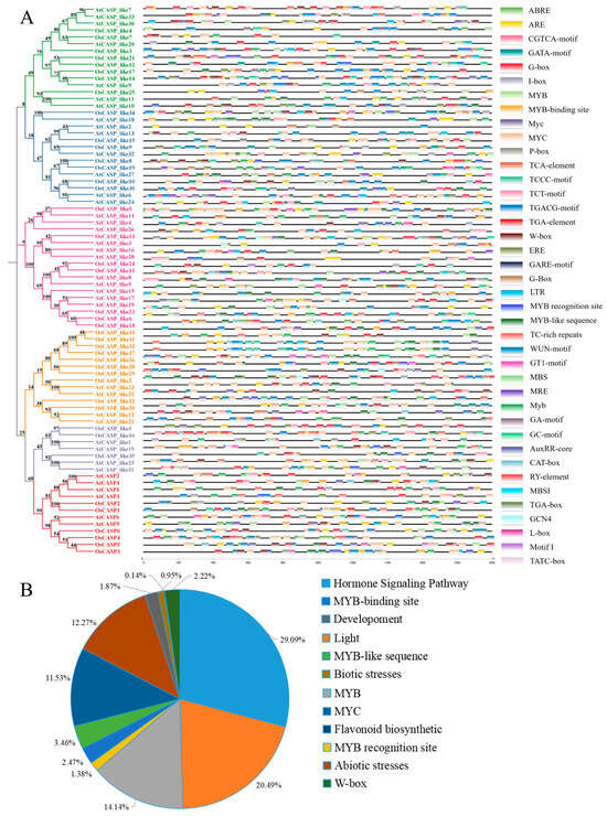 The cis-elements were predicted in 2000 bp promoter sequences of AtCASPs and OsCASPs. (A) The cis-elements were analyzed by plantcare. The different colors represent different subgroups. (B) The percentages of the different cis-elements out of all cis-elements.