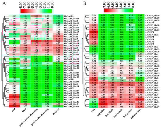 The expression pattern analysis of CASP genes in different tissues of rice and Arabidopsis. (A) The expression patterns of OsCASP genes in different tissues (root, stem, panicle before flowering, panicle after flowering and flag leaf). (B) The expression patterns of AtCASP genes in different tissues (root, cotyledon, leaf blade, leaf midrib, leaf petiole and inflorescence). The heatmap was constructed by Tbtools v2.121 software (Beijing, China). The red and green boxes indicate high and low expression levels of the AtCASP and OsCASP genes, respectively.