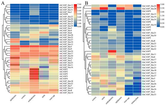 The expression patterns of CASP genes in different root cells of Arabidopsis and rice. (A) The expression patterns of AtCASP genes in different root cells (epidermis, cortex, endodermis, stem and root cap). The single-cell transcriptome data of the AtCASP genes in Arabidopsis roots were collected from the PPRD (http://ipf.sustech.edu.cn/pub/plantrna/, accessed on 20 May 2024). (B) The expression patterns of OsCASP genes in different root cells (epidermis, cortex, endodermis, stem, root cap and metaxylem). The single-cell transcriptome data of the OsCASP genes in rice roots were collected from the Root Cell Atlas in Rice (RCAR) (http://www.elabcaas.cn/rcar/index.html, accessed on 20 May 2024). The heatmap was constructed by Tbtools v2.121 software (Beijing, China). The red and blue boxes indicate high and low expression levels of the AtCASP and OsCASP genes, respectively.