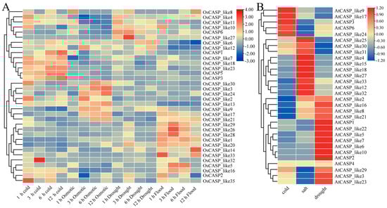 The expression patterns of OsCASP and AtCASP genes under different abiotic treatments. (A) The data are shown in a heatmap with the OsCASP gene expression in cold, osmotic, drought and flood treatments with row-scaled FPKM values. (B) The data are shown in a heatmap with the AtCASP gene expression in cold, salt and drought treatments with row-scaled FPKM values. The heatmap is constructed by Tbtools v2.121 software (Beijing, China). The red and blue boxes indicate high and low expression levels of the OsCASP and AtCASP genes, respectively.