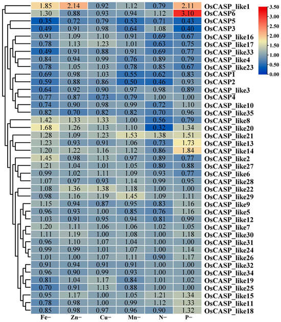 The expression patterns of OsCASP genes under iron deficiency, zinc deficiency, copper deficiency, manganese deficiency, nitrogen deficiency and phosphorus deficiency treatment by RNA-seq. The heatmap was constructed by Tbtools v2.121 software(Beijing, China). The red and blue boxes indicate high and low expression levels of the OsCASP genes, respectively.