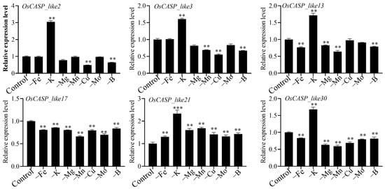 The relative expressions of the OsCASP genes were detected by RT-qPCR under iron deficiency, potassium deficiency, magnesium deficiency, manganese deficiency, copper deficiency, molybdenum deficiency and boron deficiency treatment. The −Fe, −K, −Mg, −Mn, −Cu, −Mo and −B represent iron deficiency, potassium deficiency, magnesium deficiency, manganese deficiency, copper deficiency, molybdenum deficiency and boron deficiency, respectively. The rice seedlings were cultured with Kimura B solution for 7 days, then transferred into normal solution, −Fe (0 µM Fe (II)-EDTA), −K (0 mM K2SO4), −Mg (0 mM MgSO4·7H2O), −Mn (0 µM MnCl2·4H2O), −Cu (0 µM CuSO4·5H2O), −Mo (0 µM (NH4)6Mo7O24·4H2O), or −B (0 µM H3BO3) for 3 days, respectively. Samples were obtained at 3 days post-treatment. All dates are the means ± SD of three biological replicates. The significance analysis was calculated by Prism 9 software (using Student’s t-test, ** p < 0.01, *** p < 0.001). OsActin was used as the internal reference for the RT-qPCR analysis.
