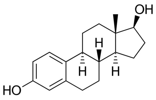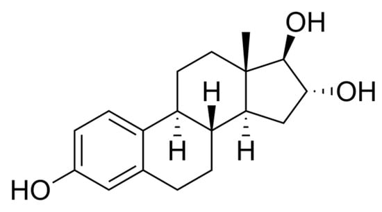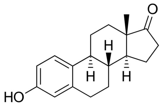 The breakthrough research step took place in 1929, when Adolf Butenandt and Edward Adelbert Doisy independently isolated and determined the structure of estrogen []. There are three main endogenous estrogens as follows: estrone (E1) (Figure 1), estradiol (E2) (Figure 2), and estriol (E3) (Figure 3) []. Estradiol, the most active estrogen during a woman’s reproductive years, plays a key role in many physiological functions and menstrual cycle processes.