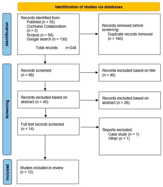 According to the previous publications, the titles were first reviewed, followed by the abstracts, and finally the full-text articles [,]. After removing the duplicates, 88 records were analyzed based on the titles, 40 based on the abstracts, and 12 based on the full-text articles. One case study was excluded [], one paper was excluded because the full text could not be obtained. During the search period, the journal’s website was not operational, and a request was sent to the authors for access to the full text, but no response was received. Consequently, publications from the analysis were included [] (Figure 4).