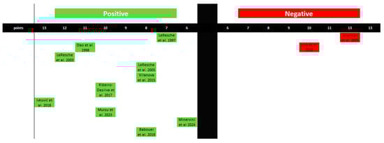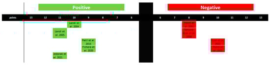 Ultimately, eight studies that met the inclusion and exclusion criteria were included in the analysis. These were works by Patil et al. (2015) []; Vilanova et al. (2015) []; Lora et al. (2016) []; Ribeiro-Dasilva et al. (2017) []; Ivković et al. (2018) []; Babouei et al. (2019) []; Fichera et al. (2020) []; Yuan et al. (2021) []; Yazici et al. (2021) []; Jedynak et al. (2021) []; Mursu et al. (2023) []; and Minervini et al. (2024) [].