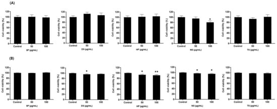 Microalgae extract (50 and 100 µg/mL) cytotoxicity in Madin-Darby canine kidney (MDCK) and Vero cells. (A) MDCK and (B) Vero cells. Values are expressed as mean ± standard deviation (SD) from three replications. * p < 0.05, ** p < 0.01 indicate values compared to serum-free medium (SFM). SP: Spirulina plantensis, DS: Dunaliella salina, HP: Haematococcus pluvialis, NS: Nannochloropsis salina, and TS: Tetraselmis sp.