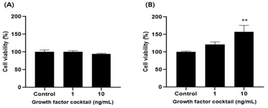 Growth factor cocktail (1 and 10 ng/mL) cytotoxicity in Madin-Darby canine kidney (MDCK) and Vero cells. (A) MDCK and (B) Vero cells. Values are expressed as mean ± standard deviation (SD) from three replications. ** p < 0.01 indicate values compared to serum-free medium (SFM).