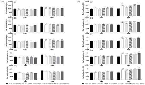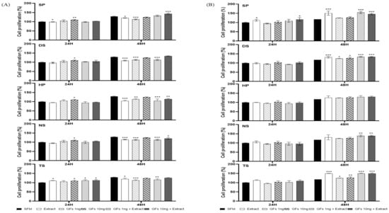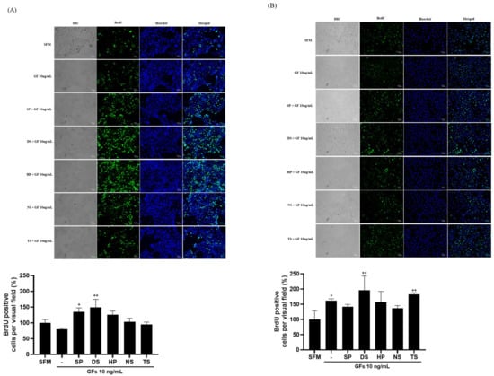 BrdU is a synthetic thymidine analog that is incorporated into DNA cells during cell division; therefore, it is commonly used for the detection of proliferating cells [20]. The percentage of BrdU-positive cells showed that the microalgae extract (50 µg/mL) and growth factor cocktail (10 ng/mL) increased in MDCK cells compared to SFM in the following order: DS 149.56%, SP 134.64%, HP 126.15%, and NS 103.64%. However, TS showed lower proliferation than SFM at 95.20%, but higher proliferation than when treated with only the growth factor cocktail (Figure 6A). Vero cells proliferated in all extracts compared with SFM. The growth factor cocktail showed a high proliferation of 161.34%, but DS 195.50% and TS 182.11% with the added microalgae extract showed higher proliferation. In particular, when MDCK and Vero cells were compared, high cell proliferation was observed in the DS group (Figure 6B).