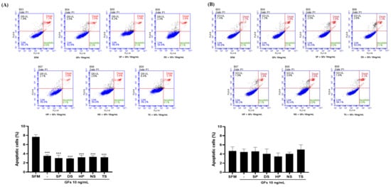 Apoptosis induced by the microalgal extract (50 µg/mL) and growth factor cocktail (10 ng/mL) was confirmed (Figure 7). MDCK cells showed SFM of 7.65%, SP of 3.50%, DS of 2.95%, HP of 3.2%, NS of 3.30%, and TS of 3.20%. When compared to SFM, microalgae extract (50 µg/mL) and growth factor cocktail (10 ng/mL) did not induce apoptosis or death. Vero cells showed SFM of 4.65%, SP of 4.55%, DS of 4.05%, HP of 3.45%, NS of 4.05%, and TS of 4.95%. Microalgae extracts, excluding TS, did not induce more apoptosis or death than SFM.
