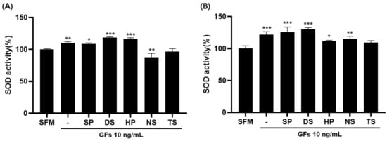 Superoxide dismutase (SOD) activity of microalgae extract and growth factor cocktail. (A) Madin-Darby canine kidney (MDCK) and (B) Vero cells. Values are expressed as mean ± standard deviation (SD) from three replications. * p < 0.05, ** p < 0.01, and *** p < 0.001 indicate values compared to serum-free medium (SFM). SP: Spirulina plantensis, DS: Dunaliella salina, HP: Haematococcus pluvialis, NS: Nannochloropsis salina, TS: Tetraselmis sp.