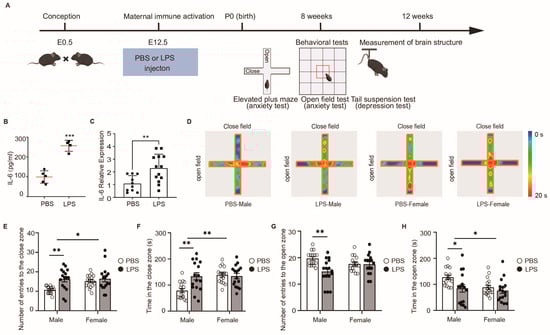 Pregnant mothers received an intraperitoneal dose of 60 μg/kg LPS or vehicle (Phosphate Buffered Saline, PBS) on embryonic day (E) 12.5. As shown in Figure 1A,B, the administration of LPS led to a statistically significant increase in IL-6 levels in serum at 3 h post-injection (p < 0.05), compared with the injection of PBS mothers, confirming effective MIA. Additionally, a notable increase in IL-6 gene expression was observed in the placenta (p < 0.01) (Figure 1C). Subsequently, considering that MIA can lead to behavioral abnormalities in offspring, we assessed the progeny from the PBS and LPS groups using the elevated plus maze test, a recognized method for analyzing anxiety-like behaviors. The results indicated that the adult male offspring in the LPS group exhibited an increased number of entries and longer durations in the closed arms compared to offspring in the PBS group, suggesting an escalation in anxiety-like behavior (Figure 1D–F). Conversely, these males exposed to LPS showed a reduction in entries and time spent in the open arms, reinforcing the concept of heightened anxiety (Figure 1D,G,H). Interestingly, no such differences were observed between female offspring in the LPS and PBS groups, indicating that MIA induced by LPS administration may have sex-specific effects on anxiety levels, with more pronounced impacts on male than on female offspring. Taken together, these data demonstrate that LPS-induced MIA promotes anxiety in male offspring.