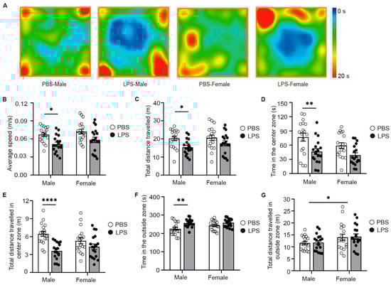 To further confirm our initial findings, we extended our investigation with open-field tests on the offspring of the PBS and LPS groups. To further confirm our preliminary findings, we extended the open-field testing to the offspring of both the PBS and LPS groups, again to assess anxiety-like behavior. The findings highlighted that adult male offspring exposed to LPS experienced a notable decrease in the average speed and distance traveled (Figure 2A–C), correlating with a significant reduction in the time they spent in the central zone and an accompanying increase in the time spent in the outside zone (Figure 2A,D–F). Nonetheless, the total distance traveled in the outside zone remained unchanged (Figure 2G), implying an escalation in anxiety-like behaviors among the male offspring. Conversely, no significant behavioral variations were observed between the LPS and PBS groups for adult female offspring, aligning with the outcomes of the elevated plus maze test. In conclusion, MIA triggered by LPS revealed clear sex-specific disparities, with anxiety-like behaviors being markedly more evident in male offspring.