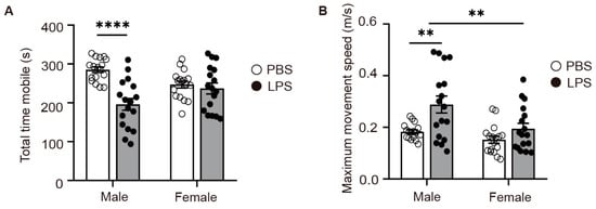 Considering the emotional impact of LPS-induced MIA on offspring, we proceeded to evaluate depressive-like behaviors in the progeny from the PBS and LPS groups utilizing the tail suspension test. Our findings revealed that the male offspring in the LPS group had a considerably diminished total mobile time compared to the PBS group males (Figure 3A), indicative of heightened depressive-like behaviors in LPS-exposed males. Moreover, the LPS-exposed males demonstrated a significantly higher maximum movement velocity compared to their PBS counterparts (Figure 3B), suggesting a more vigorous initial struggle. Strikingly, no discernible differences were observed in the total mobile time or maximum movement speed between female offspring in the LPS and PBS groups, indicating that the depressive-like responses to LPS-induced MIA are more pronounced in males. The insights derived from the tail suspension test are instrumental in clarifying how early environmental influences, such as MIA, can differentially mold the neurodevelopmental paths of male and female offspring. This further emphasizes the critical need to integrate sex as a key variable in neuropsychiatric investigative frameworks.