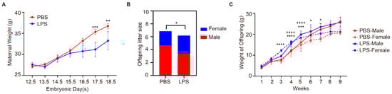 Following the induction of MIA via LPS, we monitored the subsequent effects on the development of the offspring, with a focus on weight changes as a key indicator of physiological impact. After intraperitoneal injection of LPS in pregnant mice, there was no significant difference in body weight during the first three days. From E15.5 to E18.5, LPS-treated dams showed significantly less weight gain compared to PBS-treated controls, with notable differences at E17.5 (p < 0.01) and E18.5 (p < 0.001) (Figure 4A). Subsequently, we conducted a count of the number of male and female offspring, and the results showed that compared with the control group, the number of LPS offspring was significantly reduced (p < 0.05), which is consistent with the previously observed decrease in the body weight of the mother mice. At the same time, we found a decreasing trend in the number of male offspring and an increasing trend in the number of female offspring in the LPS group, underscoring the impact of maternal LPS exposure on litter size (Figure 4B). Weekly measurements of offspring body weights revealed that LPS-exposed males exhibited increased growth compared to PBS males, especially between weeks 4 and 5 (p < 0.0001), while female offspring showed similar growth patterns across groups, with some differences from week 3 (p < 0.0001) (Figure 4C). The sex-specific weight progression of offspring uncovers a discernible trend in offspring from the LPS group, indicating an effect on growth kinetics. These findings collectively suggest that maternal LPS exposure, while not causing drastic changes in the sex ratio, may have significant and subtle effects on offspring development (particularly in males) and influence litter size, which is an important consideration in the context of developmental studies.