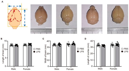 Aberrations in behavior are often associated with modifications in the cerebral cortex’s structure, a significant developmental stage that commences at embryonic day 11 in mice []. Administering LPS via intraperitoneal injection at embryonic day 12.5, we triggered physiological alterations with the potential to impact offspring’s cerebral cortical development. Cortical disarray is a defining characteristic of neuropsychiatric disorders [,], and MIA is known to exert significant influence on the development of the cortex []. This relationship underscores the intricate interplay between early immune challenges and the structural integrity of the brain’s cognitive hubs. Consequently, we scrutinized the brain structures of 8-week-old adult offspring from both the PBS and LPS groups. Our findings indicated no significant discrepancies in the dimensions of brain length, width, or cortical length between the PBS and LPS-exposed offspring, suggesting that LPS-induced MIA did not substantially impact the global morphological development of the brain within the parameters we measured (Figure 5A–D). This divergence in cortical area enlargement among LPS-exposed females, devoid of analogous changes in males or other morphometric assessments, points to a sophisticated and intricate interplay between in utero inflammatory exposures and brain maturation. It signifies that while some morphological facets of the brain may remain unchanged, elements such as cortical area could be significantly altered, with these modifications not readily evident through conventional brain size or length assessments.
