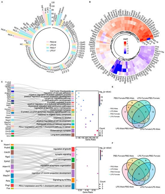Considering the significant link between cytokine variations and synaptic plasticity [], we proceeded to explore the effects of LPS on offspring’s brain development in greater detail. Utilizing PCR Array experiments, we scrutinized synaptic plasticity-related genes in the cortices of P0 mice from both the PBS and LPS groups across different sexes. The results indicated significant sex differences in the expression of genes related to synaptic plasticity, such as Ncam1, Grin2b, and Gria2 (Figure 6B). The analysis delineated a marked increase in the LPS-Male group related to the proliferation of glutamatergic synapses and mechanisms underlying long-term potentiation, as opposed to the PBS-Male group. In contrast, when compared with the PBS-Female group, the LPS-Female group showed a significant uptick in PD-L1 expression and activation of the PD-1 checkpoint pathway, which has a significant bearing on cancer biology (Figure 6C,D). These insights highlight the intricate and gender-divergent immunological reactions to MIA. Concurrently, we utilized a Venn diagram to analyze the shared and unique upregulation and downregulation of synaptic genes within the KEGG pathways of the cortex in the offspring of different sexes from the PBS and LPS groups. The findings show a notable upregulation of four synaptic genes in the male LPS offspring’s cortex versus the male P0 PBS group, and a single gene in the female LPS group compared to the female P0 PBS. Conversely, sixteen genes were downregulated in males and one in females, highlighting sex-specific responses to LPS in synaptic gene expression (Figure 6E,F). In brief, early exposure to inflammation can leave a lasting imprint on cognitive function and behavior. Delving into the pathways of cytokine-induced neuronal and synaptic changes may deepen our comprehension of the pathophysiology behind anxiety and depression, opening avenues for the development of sex-specific therapeutic approaches.
