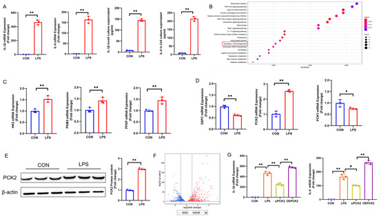 Gluconeogenesis/glycolytic pathway variation in LPS-activated KCs is associated with PCK2 upregulation. (A). IL-6 and IL-1β mRNA expression. IL-6 and IL-1β levels in culture media. (n = 3). (B) RNA-sequencing Kyoto Encyclopedia of Genes and Genomes (KEGG) enrichment analysis of transcripts expression. (C) HK2, PFKP, and PKM2 mRNA expression (n = 3). (D) G6PC, PCK1, and PCK2 mRNA expression. (E) PCK2 protein expression (n = 3). (F) RNA-sequencing show that compared with PCK2 were significantly upregulated in LPS group; (G) Expression of IL-1β and IL-6 after inhibition of PCK2 and overexpression of PCK2. Values are means ± SE, * p < 0.05 and ** p < 0.01.
