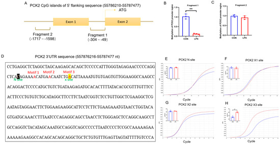 CpG island of PCK2 promoter is 5mC-demethylated and 3′UTR of PCK2 mRNA is m6A-hypermethylated in LPS-activated KCs. (A) Schematic diagram of CpG islands on the promoter of PCK2 gene. (B) 5mC is reduced in fragment 1 (−304~−49) of PCK2 gene promoter region (n = 3). (C) 5mC has not change in fragment 1 (−1717~−1590) of PCK2 gene promoter region (n = 3). (D) The m6A site was predicted for the PCK2 3′UTR. The RRACU-compliant motif was named motif 1–3 (X1–X3 site); a non-m6A modification site of this mRNA was selected as the N Site. (E–H) No significant changes in cycle of threshold (Ct) were determined at N, X1, and X2 sites, while a significant increase in PCK2 3′UTR at the X3 site was observed. Values are means ± SE, ** p < 0.01.