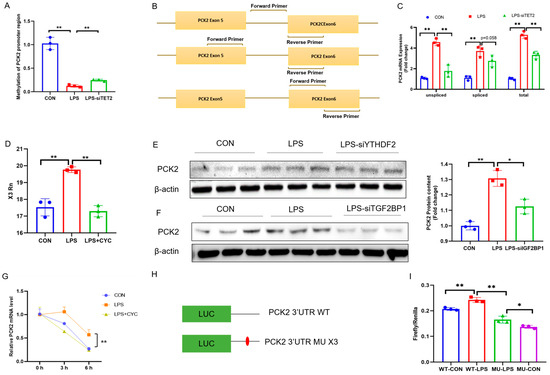 Locus-/site-specific 5mC demethylation and m6A hypermethylation contribute collectively to PCK2 upregulation in LPS-activated KCs. (A) 5mC increased in fragment 1 (−304~−49) of PCK2 gene promoter region after TET2 knockdown (n = 3). (B) TET2 knockdown reduced the increase in total mRNA in PCK2 induced by LPS (n = 3). (C) TET2 knockdown reduced the increase in un-spliced mRNA in PCK2 induced by LPS (n = 3). (D) P TET2 knockdown reduced the increase in spliced mRNA in PCK2 induced by LPS (n = 3). (E) CYC treatment rectified LPS-induced m6A hypermethylation on X3 site of PCK2 3′UTR (n = 3). (F) Knockdown IGF2BP1 mitigated PCK2 upregulation in LPS-activated KCs (n = 3). (G) CYC treatment reduced LPS resulting in increased PCK2 mRNA stability (n = 3). (H) Schematic representation of synthetic mRNAs containing PCK2 3′UTR and full-length firefly luciferase. (I) Synthetic mRNAs were transfected, and luciferase activity was detected in KCs. Values are means ± SE, * p < 0.05 and ** p < 0.01.